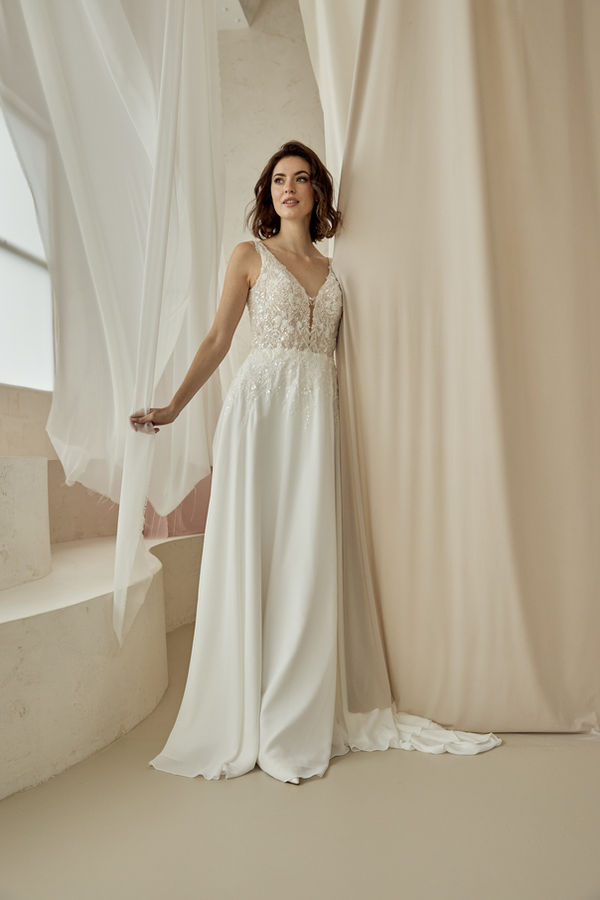 Oh so romantic! Diese leichte A-Linie besticht durch die florale Spitze und Glitzer, den tiefen V-Ausschnitt und die Schleppe samt weitem Rückenausschnitt. Perfekt für deine Sommerhochzeit!