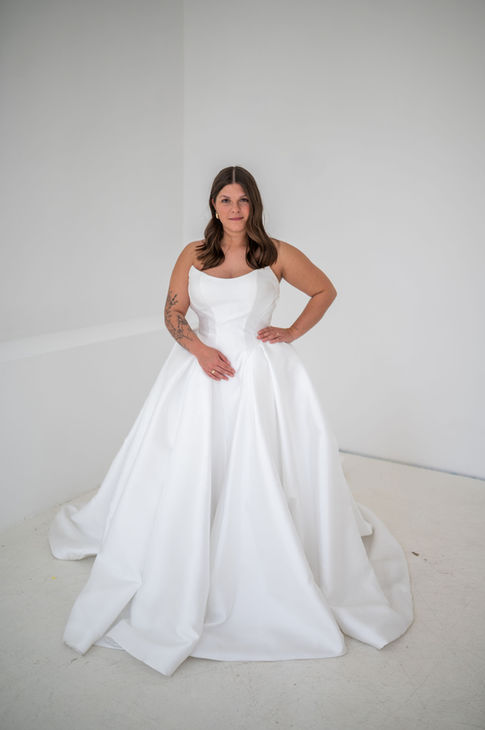 Schlicht, aber alles andere als langweilig: Dieses Brautkleid aus glattem, luxuriösem Stoff besticht durch klare Linien, Corsagenoberteil und einen eleganten, voluminösen Rock. Minimalismus trifft auf maximale Wirkung – ein absoluter Trend-Alert für alle, die modernes Bridal-Design lieben!